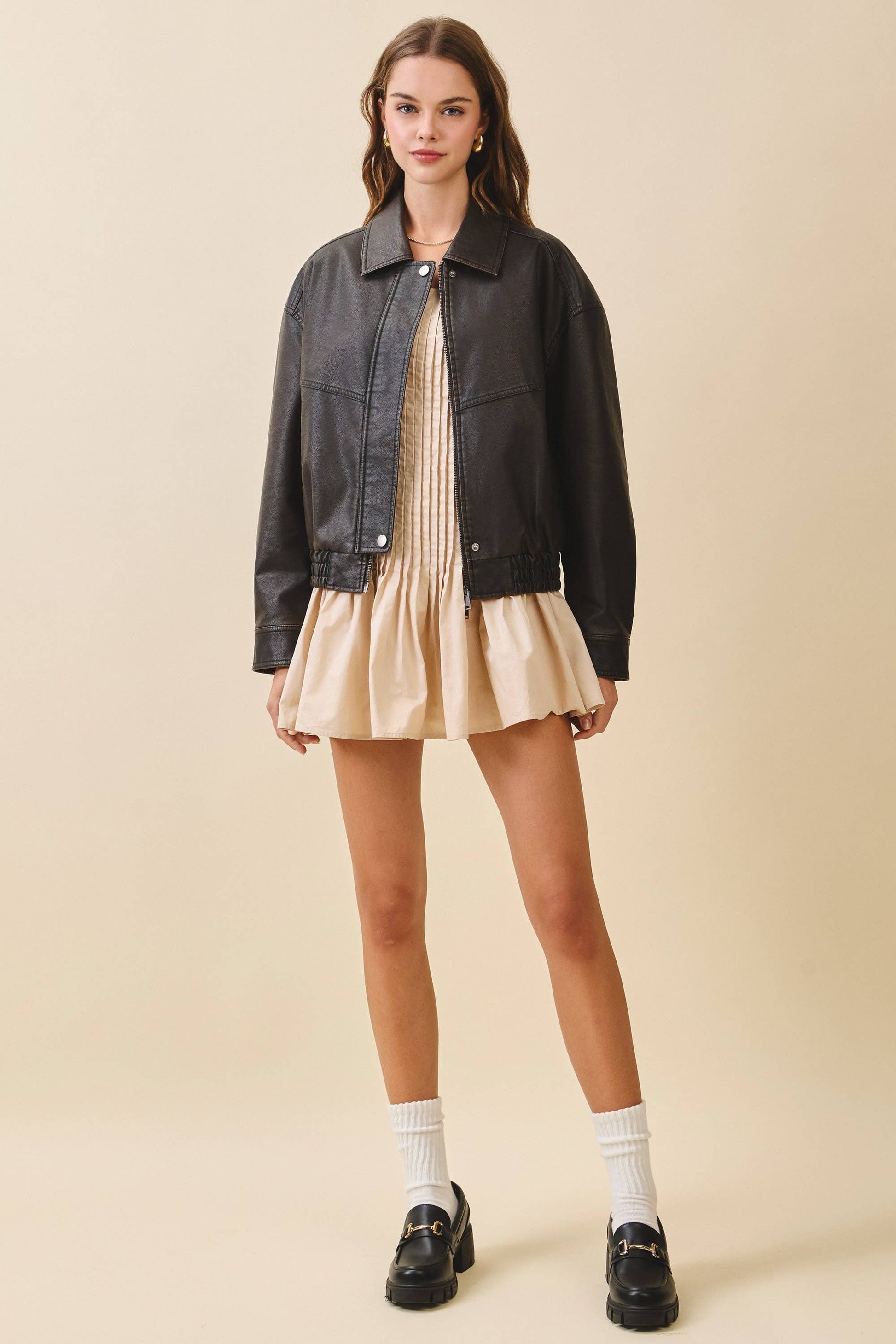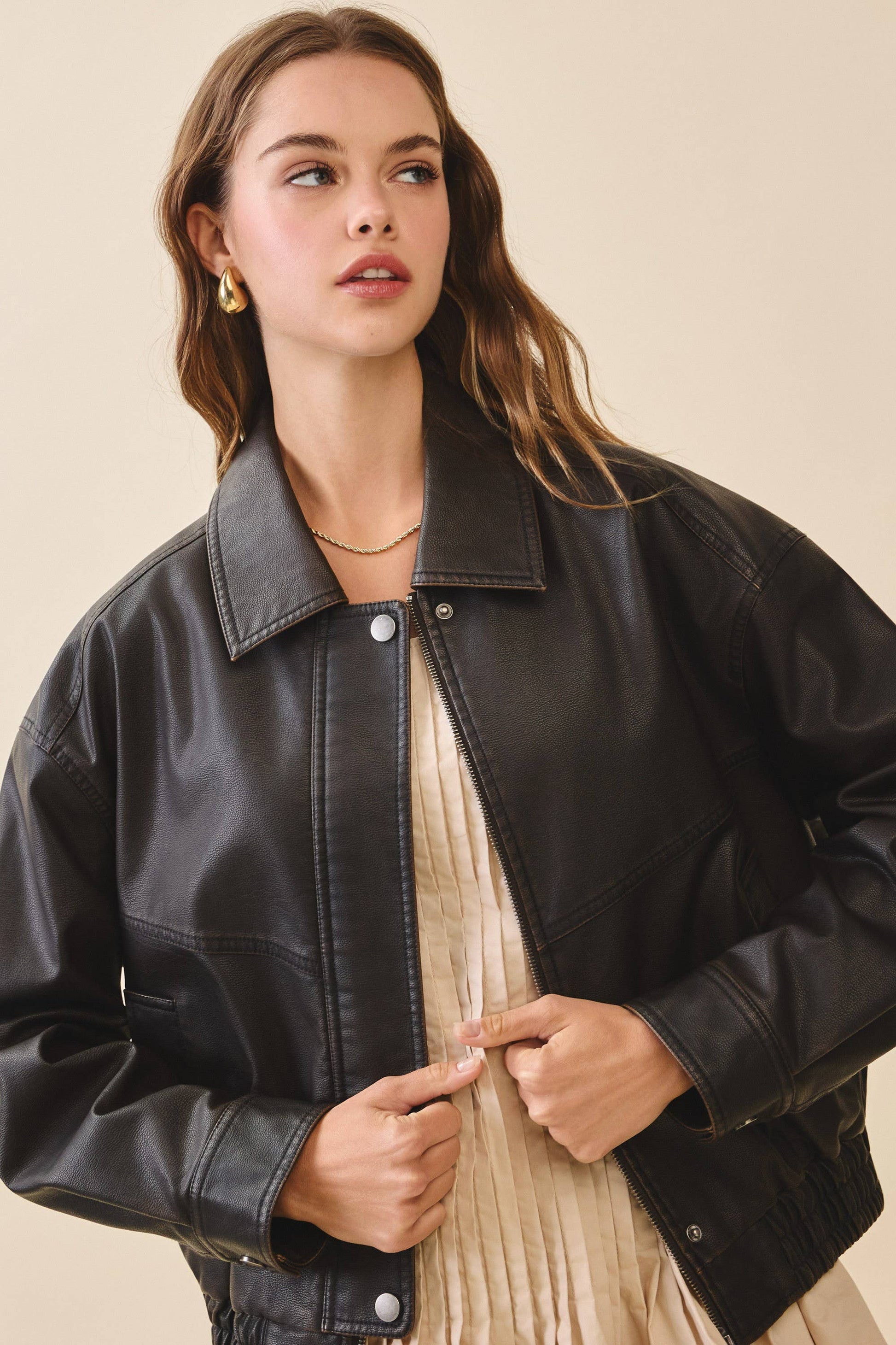 Faux leather zip-front jacket with a pointed collar, snap-cuff long sleeves, and an elasticized hem.