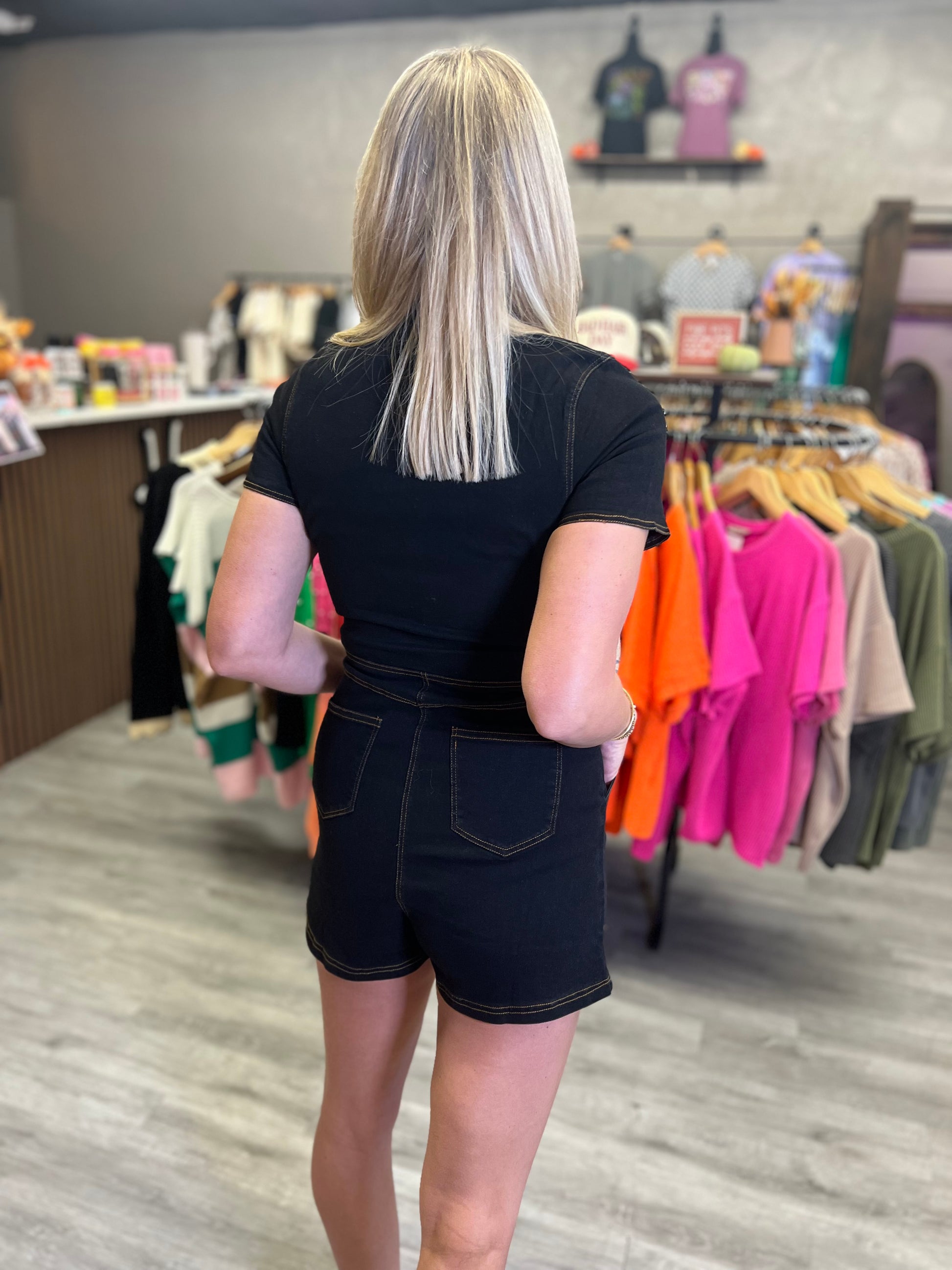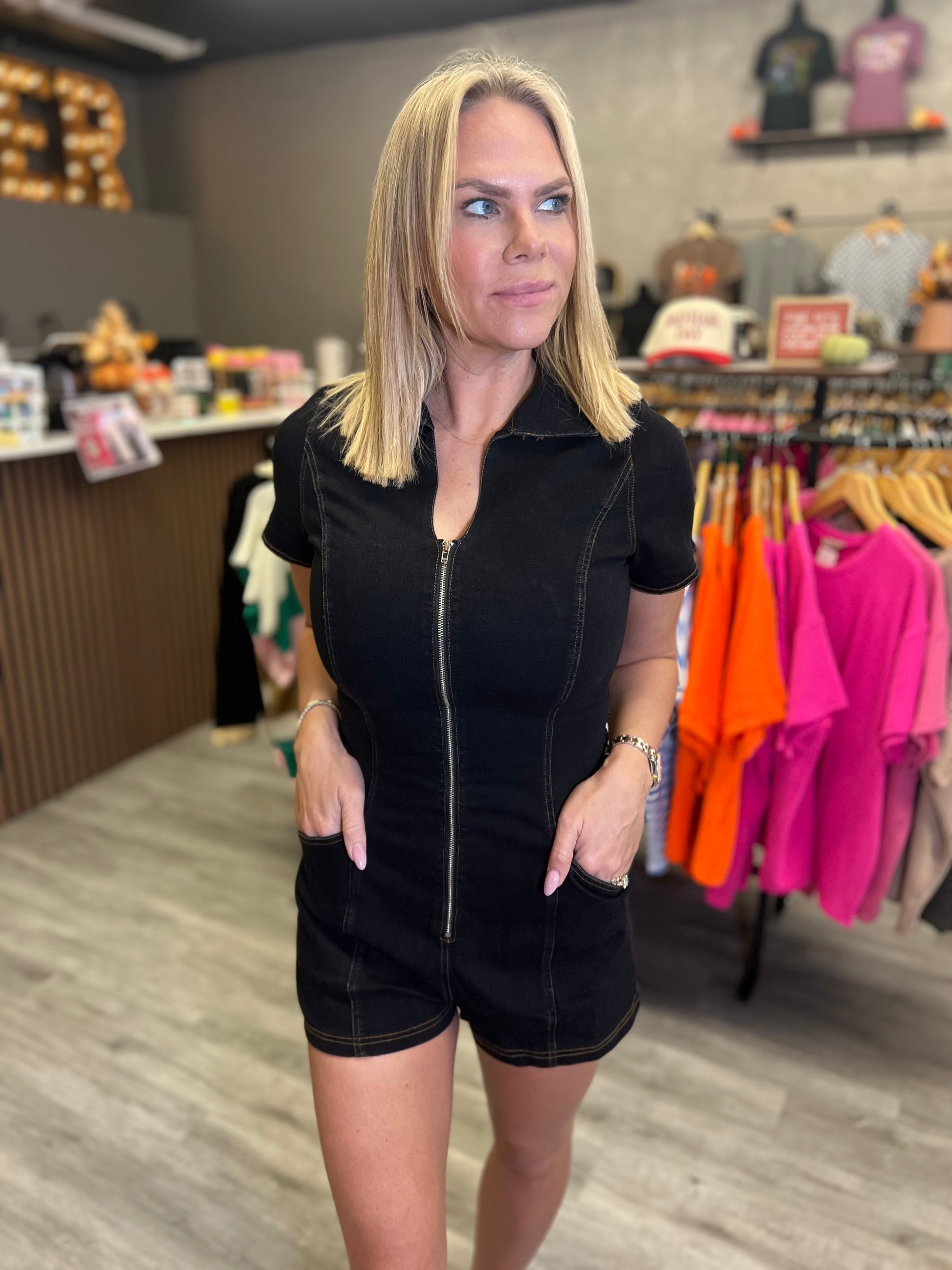 Its stylish denim fabric and zip neck design make it a versatile addition to any wardrobe. Machine washable and with short sleeves, this romper showcases our commitment to trendsetting fashion. Our design team, based in Los Angeles, ensures this romper not only looks great but feels great too. Add a dash of edgy style to your wardrobe with this fashionable romper.